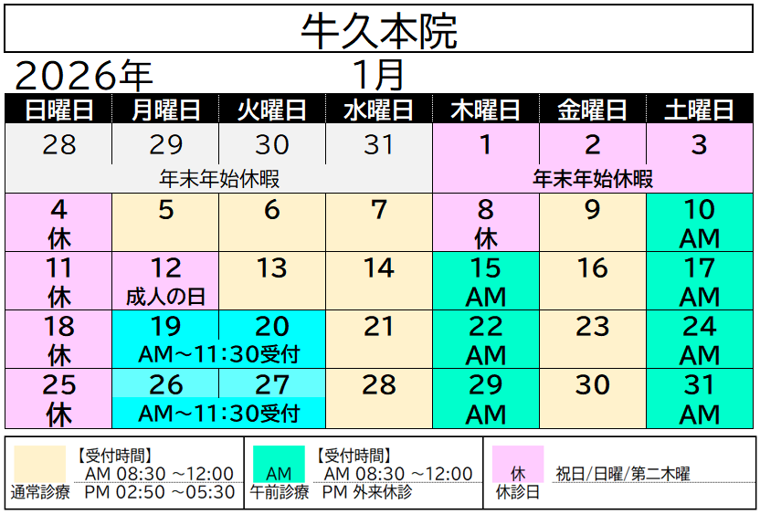 牛久院1月の診察日についてお知らせ致します。