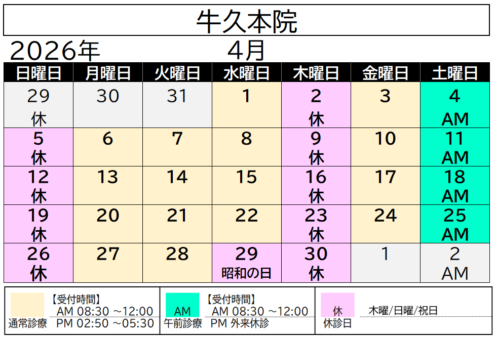 4月診療のご案内(牛久院) 2026年3月18日2026年3月18日お知らせ 牛久院4月の診察日についてお知らせ致します。 ご予約はHPから24時間いつでも受け付けております。 お電話でのご予約は、受付時間中になりますのでご注意ください。 土曜日は、外来午前診療。 2026年4月から牛久院の休診日が ”毎週木曜日・日曜日”に変更になります。 4月の休診日は、 4/29(水) 昭和の日 および毎週木曜日・日曜日になります。 ご承知おきのほどよろしくお願い致します。